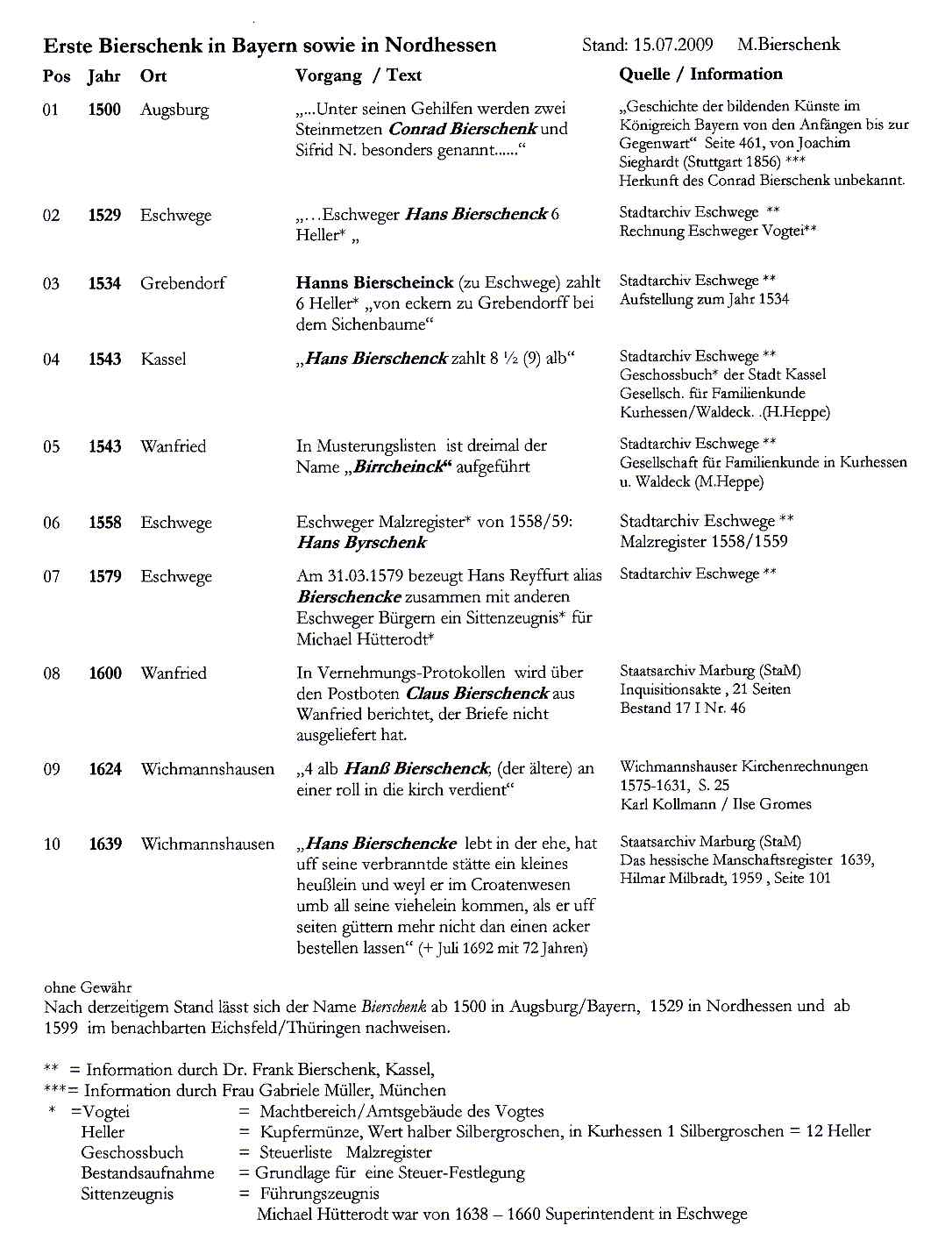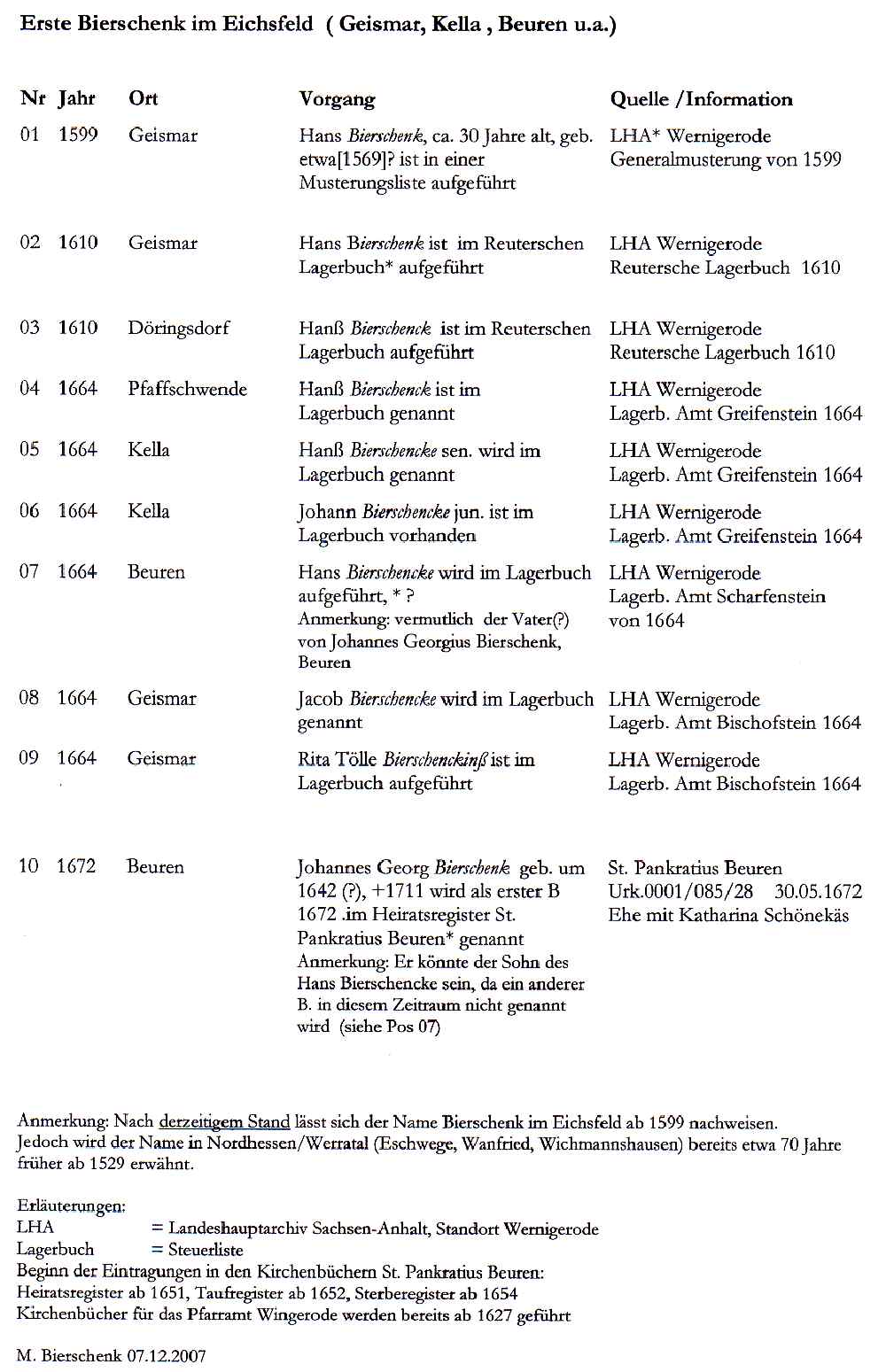 So ist z.B. jener Johannes Bierschenck (gest. Juli 1692 mit 72 J.) nicht mein ältester Vorfahr (aus der Ahnenreihe Lieberum meiner Frau): Anfang Maerz 1639 heisst es fuer Wichmannshausen: „Hans Bierschencke lebt in der ehe, hat uff seine verbrandte stätte ein kleines heußlein undt weyl er im Croatenwesen umb alle sein viehelein kommen, als er uff seinen güttern mehr nicht dan einen acker bestellen lassen. Jener Hans muss also der Vater jenes 1620 geborenen sein; umgekehrt gibt es nach meinen Unterlagen (ab 1502 ....) keine älteren B. in Wichmannnshausen: Ich vermute die Herkunft aus Eschwege. ... " von Dr. Frank Schneider-Sickert (schneidersickert@t-online.de)